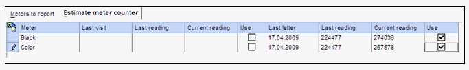 Button to fill all open meter reading letters for the selected department with the latest known service meter. If there are some meters you do not want to use, these can be deleted one by one. |