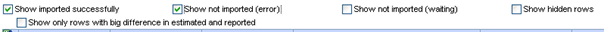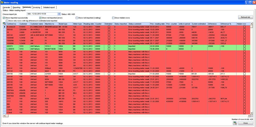 You can choose if you only want to see the rows that where imported with success or the rows that not could be imported or all rows. You can also choose to only see imported rows with a big difference between reported and estimated readings. (The setting “COMPANY_YYY \ CONTRACT \ METER_IMPORT_PERCENT_CHECK” decides how many percent difference to check for)