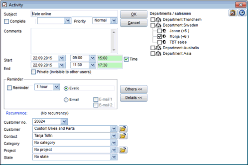 If you add an activity with a customer in another time zone you will see the time slot in the customer’s time zone as well as your own.