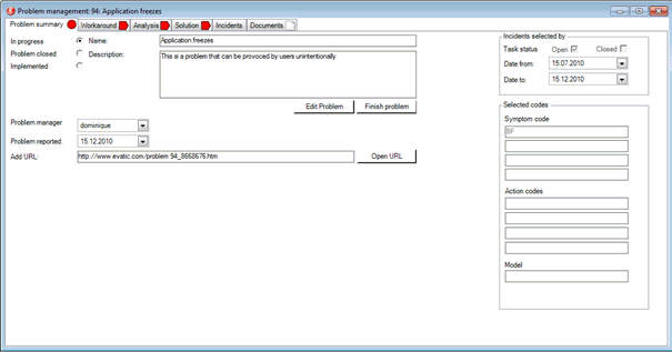 Problem status | Select the status of the problem: -In progress (red) -Problem closed (yellow) -Implemented (green) |