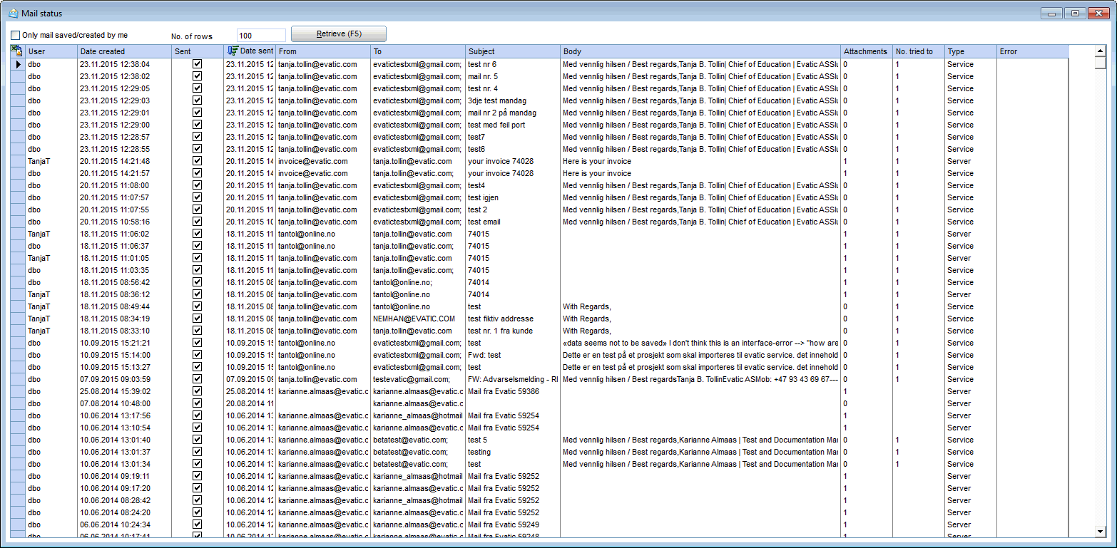 NB! The following setting must be turned on for emails to be saved in the log:: Evatic Admin \ COMPANY_XXX \ MAIL \ SAVE_MAIL_OUT = 1